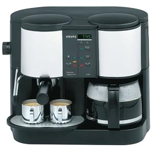 This espresso/coffeemaker by Krups is one fine combination. On the coffee side it has a 24-hour programmable clock/timer that lets you set the current time and program the timer for "wake-up" coffee. With a 10-cup serving capacity the coffeemaker automatically shuts off after two hours for added safety. And for the impatient coffee lover, there's "stop 'n' serve," which allows you to remove the carafe at any time during the brewing cycle for up to 20 seconds, serve, then replace on warming plate for continued brewing. The removable filter holder swings away for convenient refills and easy cleanup. The double-wall construction keeps heat from escaping during brewing, preserving coffee's aroma and flavor. The espresso/cappuccino side has an advanced system that ensures quick heat-up time and a rotary steam knob that enables you to steam milk or dispense hot water for tea. The "perfect froth" attachment produces great looking, tasty froth. The 37-ounce removable water reservoir produces continuous cups of espresso, so it can please a crowd.