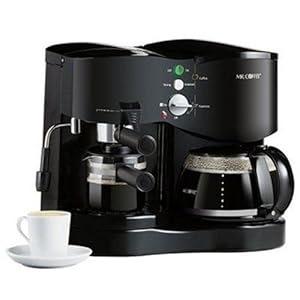 Ideal for entertaining or everyday use, this convenient two-in-one appliance can brew up to 8 cups of coffee or up to 4 cups of espresso at the same time. The espresso/coffee machine's removable cone filter basket and removable water reservoir provides easy filling, while its brew-strength setting accommodates individual preferences. And frothing or steaming milk for cappuccino and lattes is quick and easy with the variable steam control and swivel steam valve. Other useful features include a lighted "on/off" switch, a pressure safety valve, and a pause-n-serve function for pouring a cup midbrew. The unit's dishwasher-safe glass carafe and removable drip tray make cleanup a snap. A measuring scoop is included. The espresso/coffee machine measures approximately 10 by 12 by 11 inches and carries a one-year limited warranty.